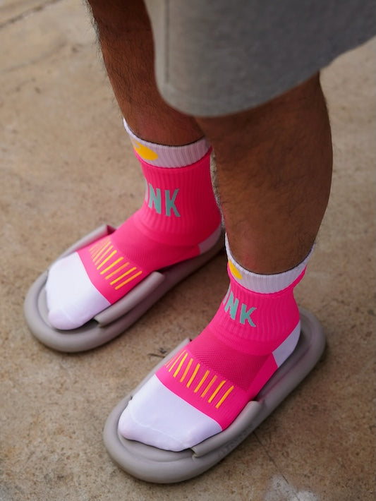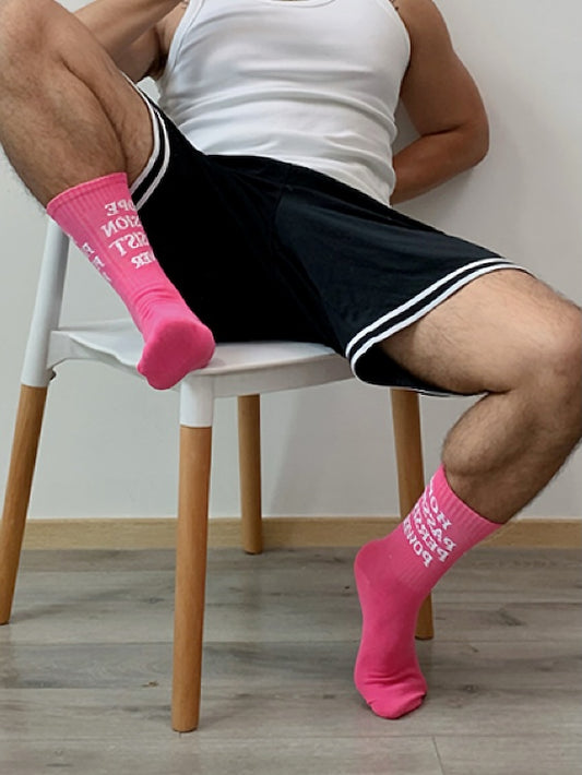 Men's Neon Pink Crew Socks with Moon and "PINK" Print