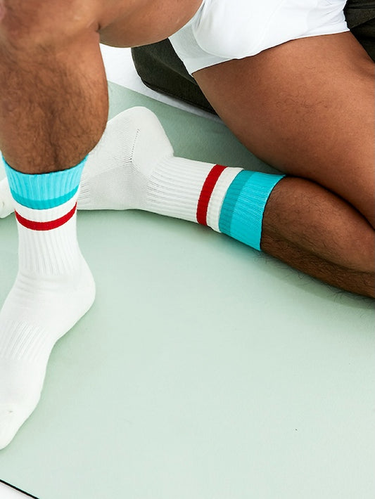 Men's White Crew Socks with Blue and Red Rings Faux Layered Design
